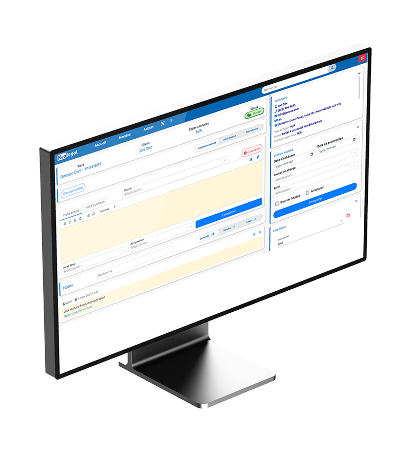 NeoDesk centralise et automatise la gestion de vos dossiers juridiques, du mandat initial à la clôture. Les agents IA intégrés à NeoDesk anticipent les prochaines étapes, vous assistent dans l’analyse, la rédaction et la gestion quotidienne, et vous permettent de générer des documents en un clic à partir de vos propres modèles. Accélérez la lecture de dossiers, automatisez la tenue de temps, et bénéficiez d’un suivi clair de vos échéances, rappels et tâches – le tout dans un seul espace de travail.